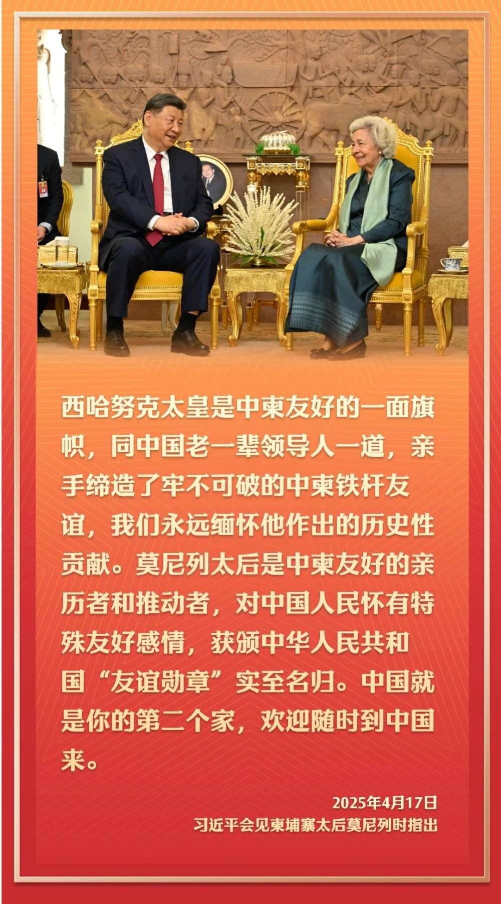 2016年10月13日,國(guó)家主席習(xí)近平在金邊看望柬埔寨太后莫尼列。莫尼列太后特意請(qǐng)習(xí)近平在西哈努克太皇生前常坐的椅子上就座。