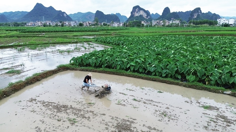 6月19日,廣西賀州市平桂區(qū)鵝塘鎮(zhèn)鵝塘村農(nóng)民操作農(nóng)機耕田(無人機照片)。