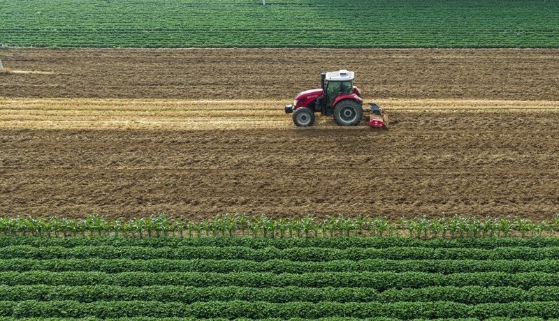 6月19日,河北省遵化市東新莊鎮(zhèn)農(nóng)民駕駛農(nóng)機旋耕土地(無人機照片)。
