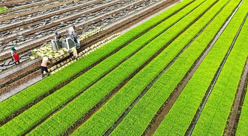 6月18日,在江蘇省海安市墩頭鎮(zhèn)千步村,農(nóng)民起水稻秧苗,準備進行水稻機插(無人機照片)。