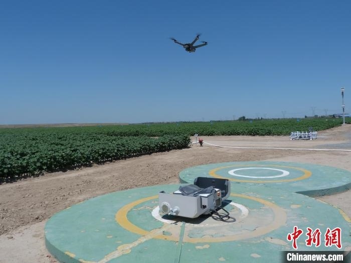 6月28日,新疆石河子市一片棉田中,遙感監(jiān)測作物長勢的無人機(jī)巡檢返回?!≮w婧姝 攝