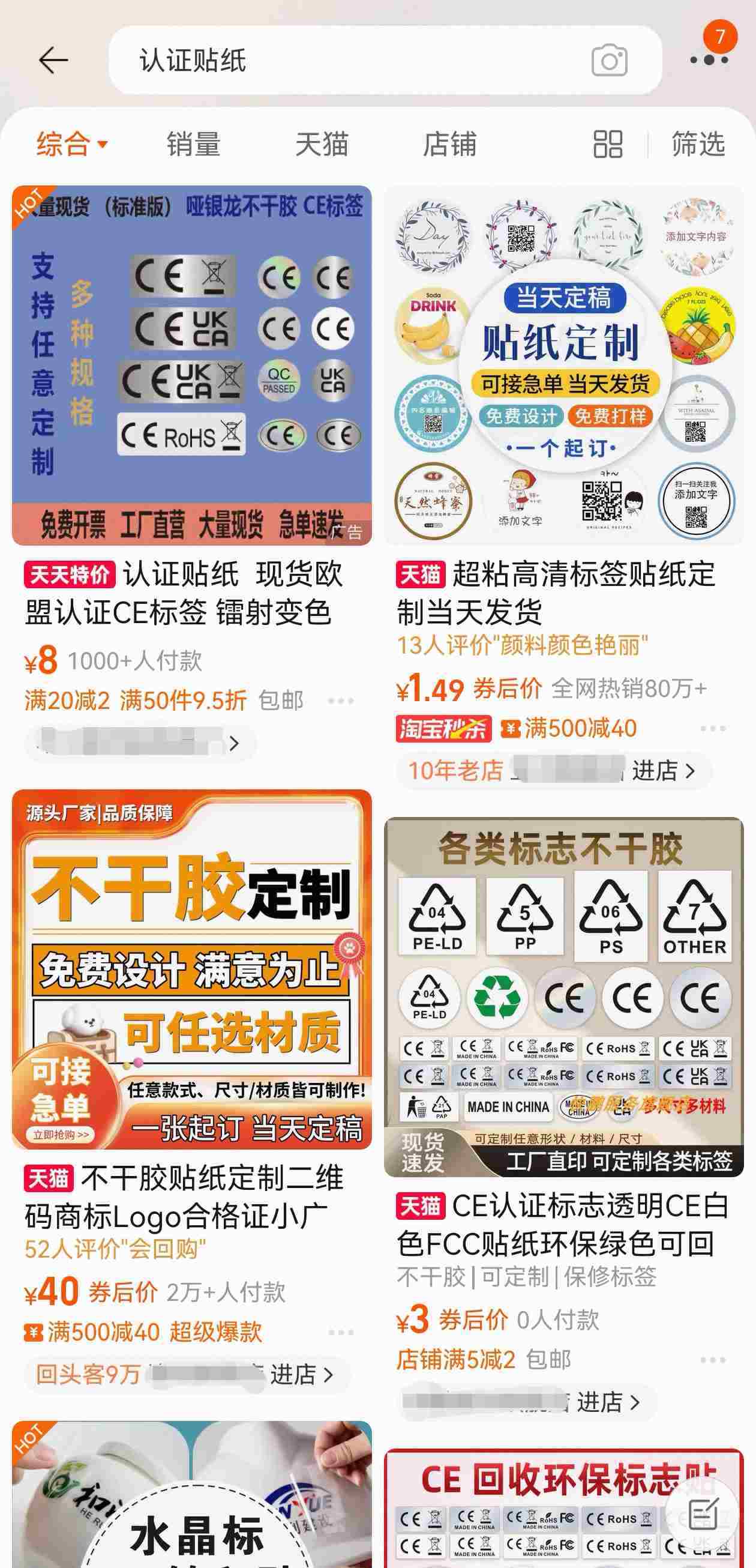 7月1日,記者在多個(gè)電商平臺(tái)發(fā)現(xiàn),雖然已無(wú)法在平臺(tái)搜索到“3C貼紙”相關(guān)商品,但仍存在大量“定制貼紙”“定制標(biāo)識(shí)”類商家。