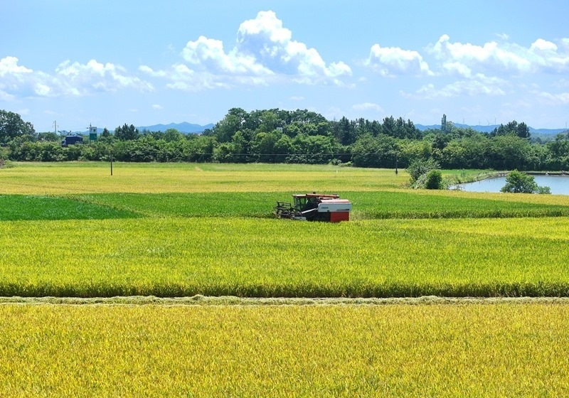 7月3日,在湖南省衡陽市衡山縣白果鎮(zhèn),村民駕駛收割機(jī)收割早稻(無人機(jī)照片)。