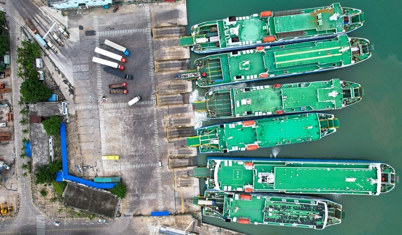 7月22日,在海口市秀英港,車輛有序駛?cè)肟蜐L船(無人機(jī)照片)。