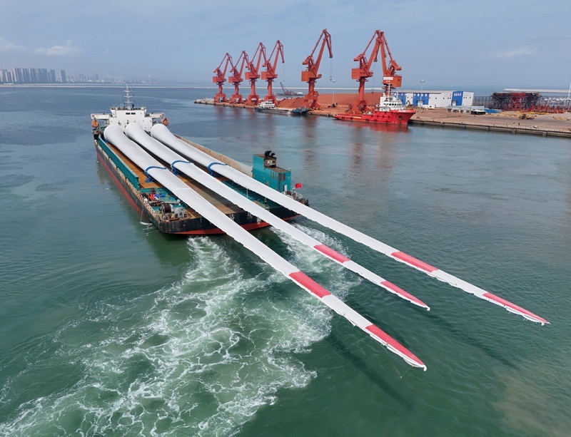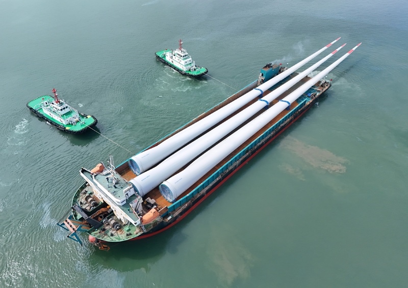 8月1日,三支超大尺寸海上風(fēng)力發(fā)電機試驗葉片在山東港口煙臺港蓬萊港區(qū)完成裝船并運往試驗基地。該型葉片長達(dá)153米,重83.5噸,屬于150米級超大尺寸海上風(fēng)電葉片,現(xiàn)已完成全部靜力測試,即將在試驗基地進行疲勞測試驗證。