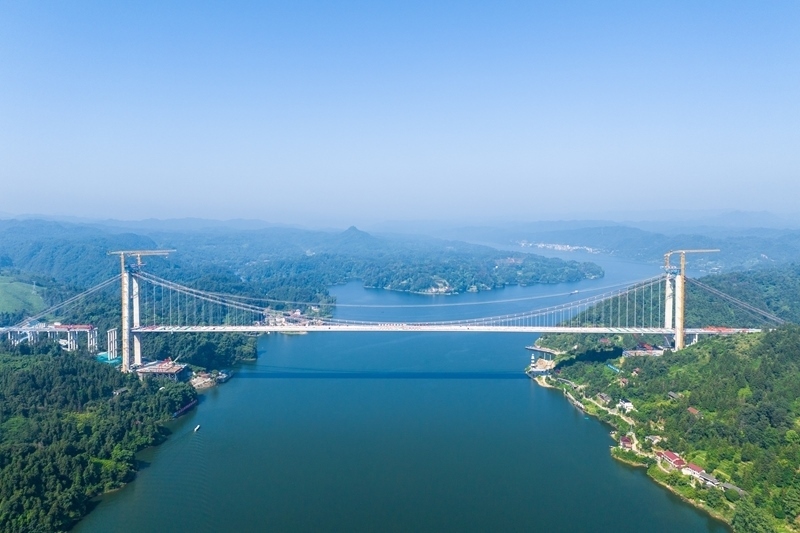 這是8月3日在懷化市沅陵縣拍攝的施工中的張官高速洞庭溪沅水特大橋(無人機(jī)照片)。