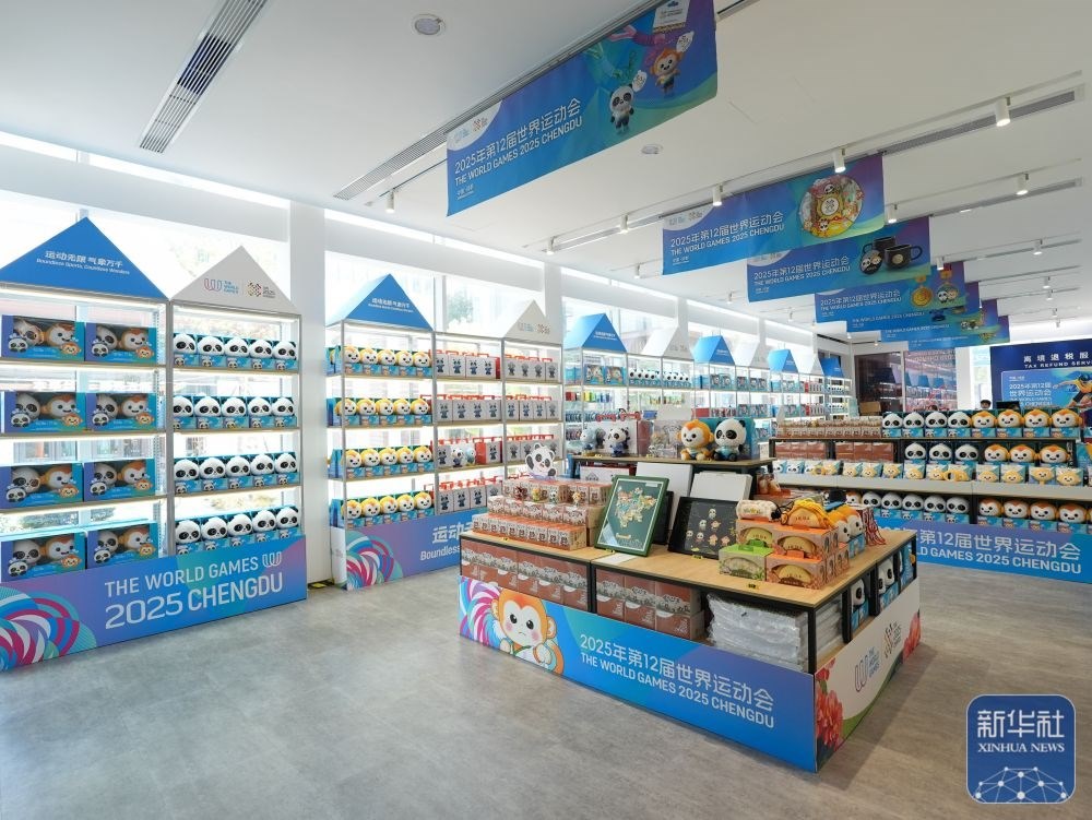 ↑ 這是8月3日在成都世運(yùn)會(huì)運(yùn)動(dòng)員村A區(qū)拍攝的官方特許商品零售店內(nèi)的紀(jì)念品。新華社記者 王曦 攝