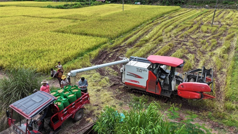 8月31日,在福建省南平市浦城縣仙陽鎮(zhèn),村民駕駛收割機在田間作業(yè)(無人機照片)。