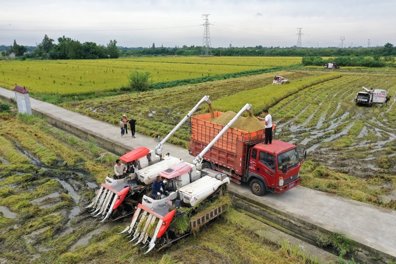 8月31日,在四川省眉山市東坡區(qū)太和鎮(zhèn),村民利用收割機搶收水稻(無人機照片)。