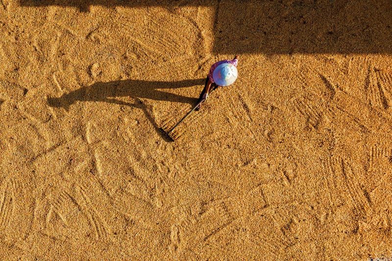 9月2日,山東省臨沂市平邑縣臨澗鎮(zhèn)農民在晾曬收獲的玉米(無人機照片)。