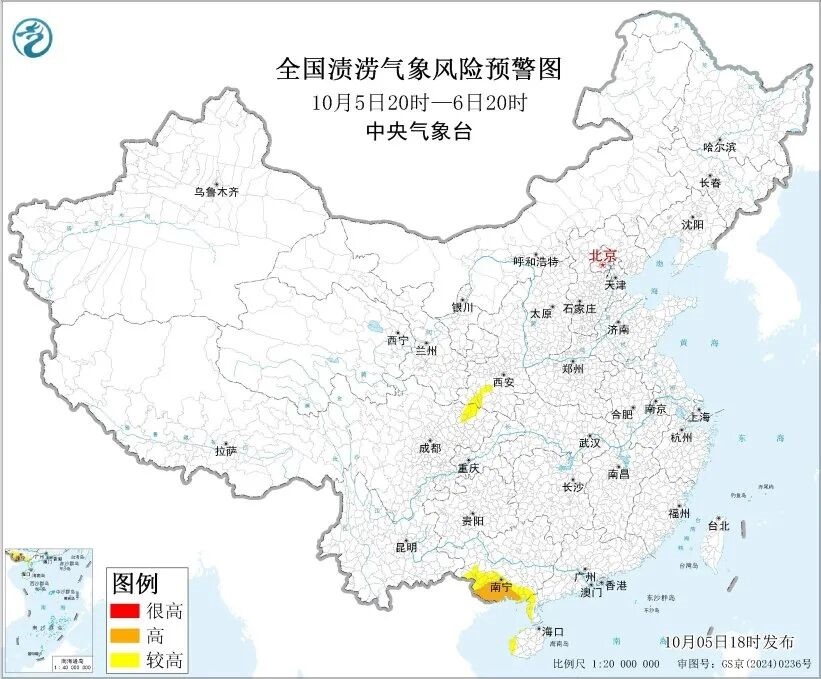 中央氣象臺10月5日18時發(fā)布漬澇風險氣象預報:受強降雨的影響,預計10月5日20時至6日20時,廣東西南部、廣西南部和西部、海南西部、四川東北部、陜西西部等地部分地區(qū)發(fā)生漬澇的氣象風險較高,其中,廣西南部等地部分地區(qū)發(fā)生漬澇的氣象風險高,易形成城市內澇和農田漬害,需加強防范。