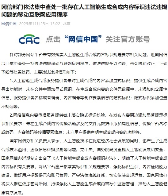針對(duì)部分網(wǎng)站平臺(tái)未有效落實(shí)人工智能生成合成內(nèi)容標(biāo)識(shí)規(guī)定要求相關(guān)問題,近期網(wǎng)信部門集中查處一批違法違規(guī)移動(dòng)互聯(lián)網(wǎng)應(yīng)用程序,依法依規(guī)予以約談、責(zé)令限期改正、下架下線等處置處罰。主要違法違規(guī)情形如下: