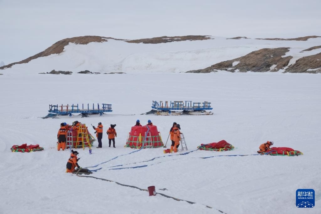 北京時(shí)間12月2日傍晚,工作人員在冰面上進(jìn)行油囊加注作業(yè)。新華社記者 顧天成 攝