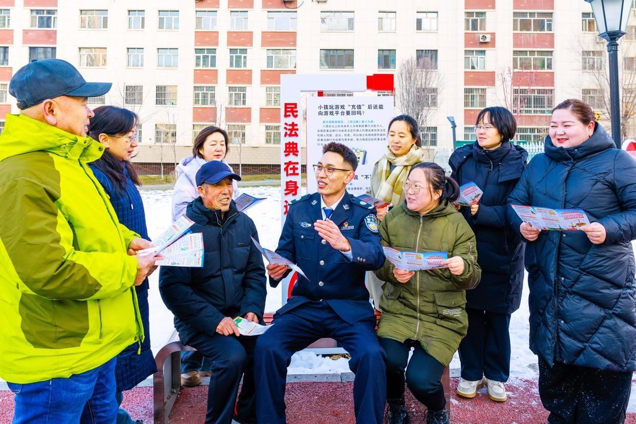 12月2日,新疆烏魯木齊市天山區(qū)幸福路街道天?;▓@社區(qū)組織黨員和志愿者上門為商戶和居民宣講憲法知識、發(fā)放憲法知識手冊、提供法律咨詢等多種形式,推動憲法宣傳教育深入人心。(工人日報通訊員 孫振嵩 攝)