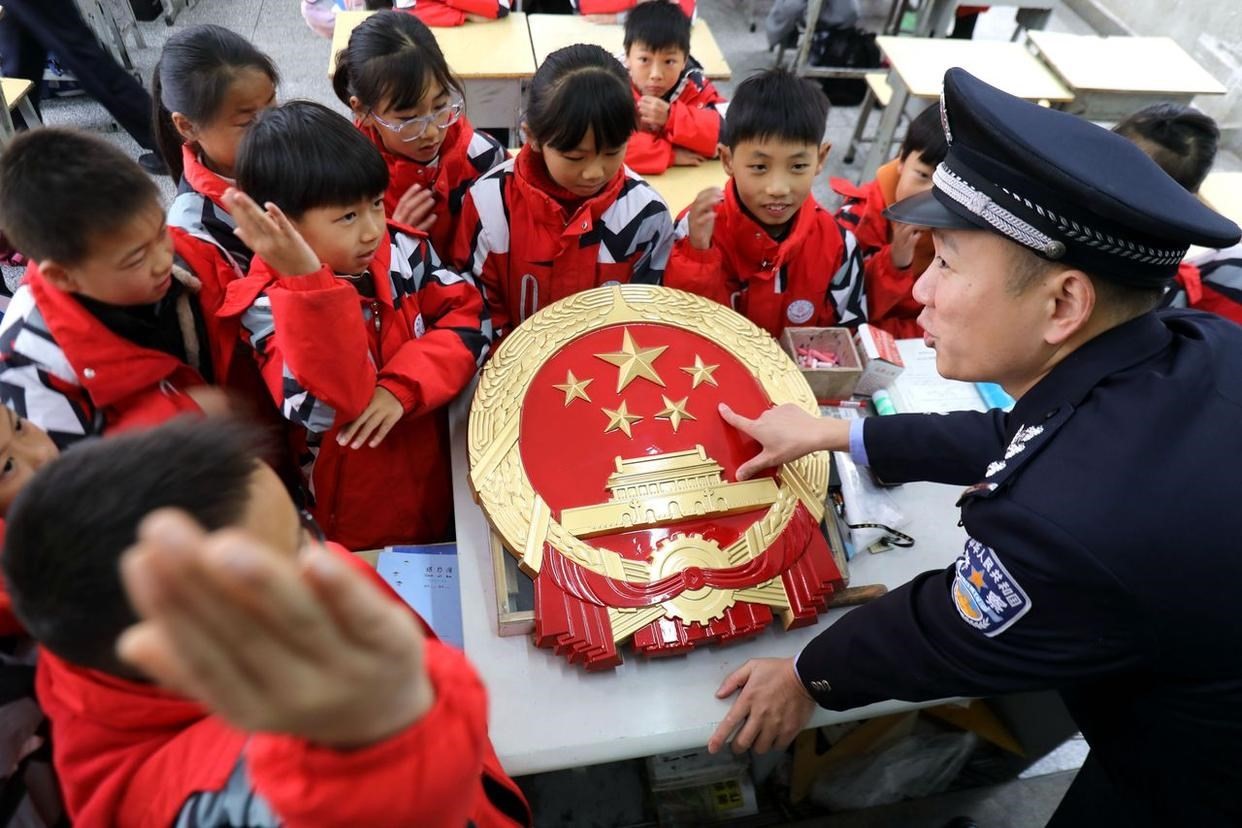 12月3日,安徽省馬鞍山市雨山區(qū)雨山實驗學校,司法干警給學生解讀憲法核心內容。(工人日報通訊員 歐宗濤 攝)