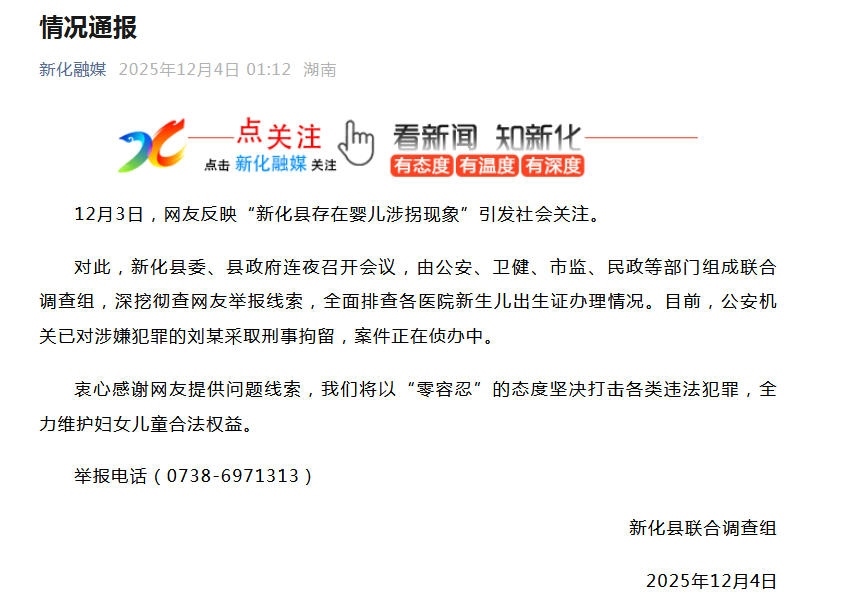 中新網(wǎng)12月4日電 針對(duì)網(wǎng)友反映的“新化縣存在嬰兒涉拐現(xiàn)象”,湖南省婁底市新化縣聯(lián)合調(diào)查組12月4日發(fā)布情況通報(bào)稱,新化縣委、縣政府連夜召開(kāi)會(huì)議,由公安、衛(wèi)健、市監(jiān)、民政等部門組成聯(lián)合調(diào)查組,深挖徹查網(wǎng)友舉報(bào)線索,全面排查各醫(yī)院新生兒出生證辦理情況。