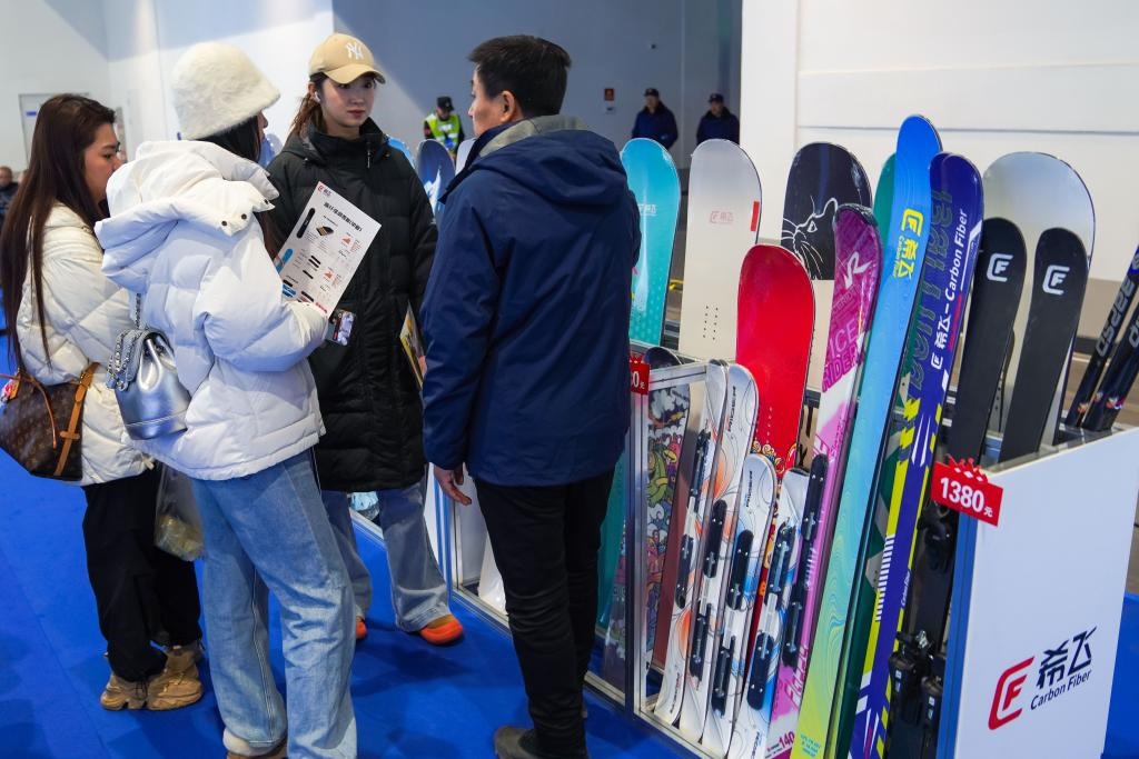12月18日,參觀者在第九屆吉林冰雪產(chǎn)業(yè)國(guó)際博覽會(huì)現(xiàn)場(chǎng)參觀展出的國(guó)產(chǎn)碳纖維滑雪板。新華社記者 許暢 攝