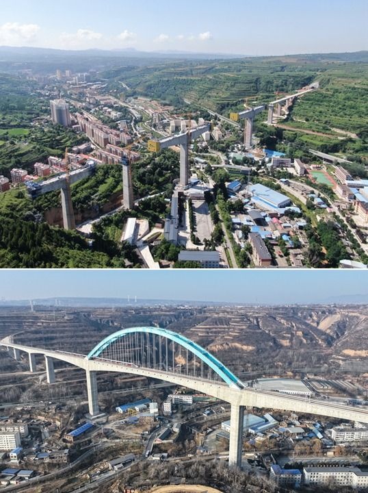 拼版照片:上圖為施工中的西延高鐵王家河特大橋(2023年7月22日攝,無(wú)人機(jī)照片);下圖為一列試運(yùn)行列車從西延高鐵王家河特大橋駛過(guò)(2025年12月10日攝,無(wú)人照片)。新華社記者 張博文 攝