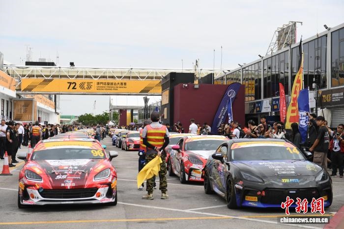 2025年11月13日,第72屆澳門格蘭披治大賽車開賽,澳門傳奇的“東望洋賽道”再度響起賽車引擎的轟鳴聲。圖為參加練習(xí)賽的賽車準(zhǔn)備出發(fā)。 中新社記者 鄭嘉偉 攝