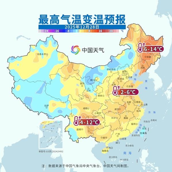 這場(chǎng)年尾超級(jí)大回暖正在席卷我國(guó)大部地區(qū),并將持續(xù)至29日。明后天,回暖幅度和范圍進(jìn)一步升級(jí),北方地區(qū)明天氣溫普遍達(dá)到高點(diǎn),南方地區(qū)將在后天(29日)前后迎來(lái)過(guò)程氣溫高點(diǎn)。其中明天,最高氣溫0℃線(xiàn)將同期少見(jiàn)地挺進(jìn)東北,并北抬至吉林中部,黃淮南部到江南普遍在15℃以上,華南也將重返20℃以上,短袖有了重新出場(chǎng)的機(jī)會(huì)。