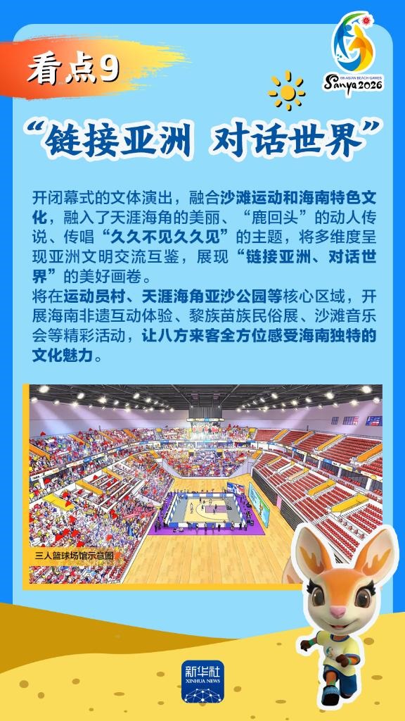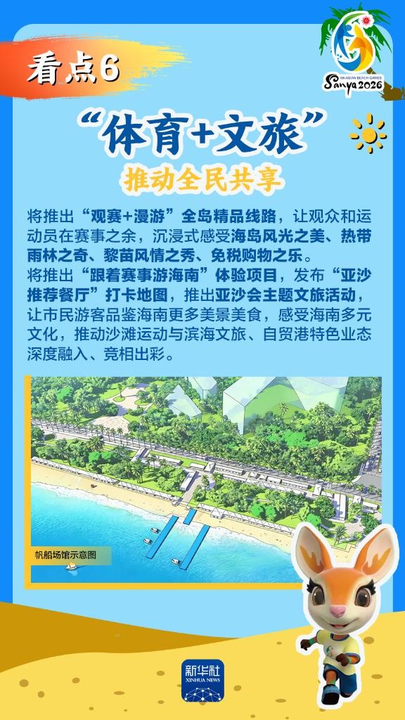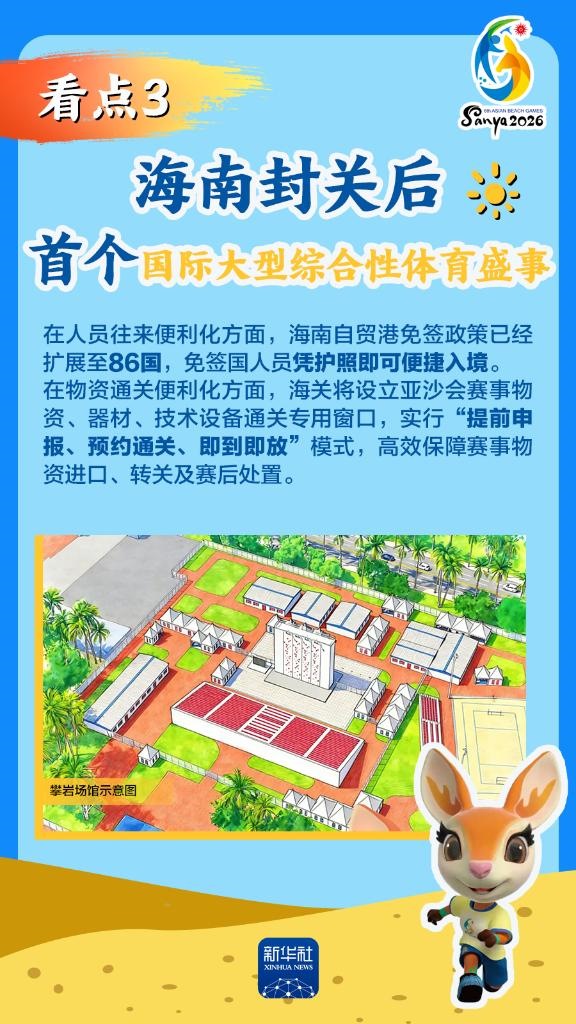 第六屆亞洲沙灘運動會(以下簡稱“亞沙會”)將于2026年4月22日至30日在海南三亞舉行,賽事歷時9天。作為海南自由貿(mào)易港封關(guān)運作后迎來的首個國際大型綜合性體育盛事,亞沙會都有哪些看點?為何值得期待?國新辦12日發(fā)布會做了詳細(xì)介紹,一起來看。
