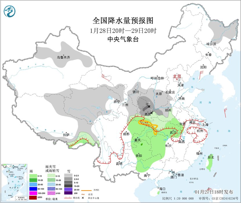 圖1 全國降水量預報圖(1月27日20時-28日20時)