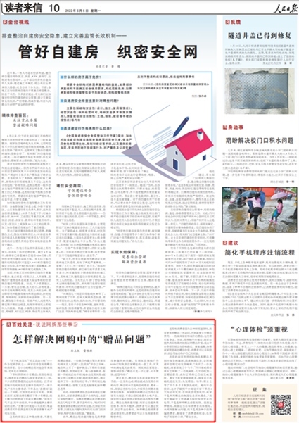 2022年6月6日,《人民日?qǐng)?bào)》讀者來(lái)信版“百姓關(guān)注”欄目《怎樣解決網(wǎng)購(gòu)中的“贈(zèng)品問(wèn)題”》一文則關(guān)注了“人民投訴”平臺(tái)用戶(hù)“下單時(shí)頁(yè)面顯示有贈(zèng)品卻未收到,客服回應(yīng)是贈(zèng)品有限、隨機(jī)抽取買(mǎi)家”等線(xiàn)上商家的失信行為。