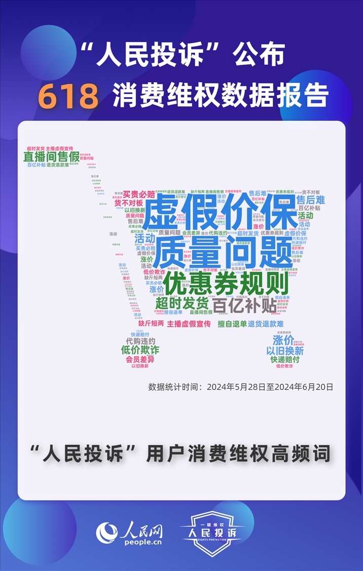 根據(jù)“人民投訴”用戶留言內(nèi)容梳理,虛假價保、質(zhì)量問題、活動欺詐、優(yōu)惠券規(guī)則不透明、超時發(fā)貨、直播間虛假營銷等成為維權(quán)高頻熱詞。