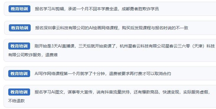 然而,“人民投訴”經(jīng)梳理發(fā)現(xiàn),網(wǎng)絡(luò)上不少消費(fèi)者吐槽相關(guān)課程質(zhì)量良莠不齊,與廣告承諾“免費(fèi)領(lǐng)取AI應(yīng)用體驗(yàn)課及AI工具”“低投入、高回報(bào)”“副業(yè)賺錢”“快速變現(xiàn)”等內(nèi)容大相徑庭。相關(guān)商家虛假宣傳、誘導(dǎo)消費(fèi)、貨不對板以及退費(fèi)難等問題被反復(fù)提及。