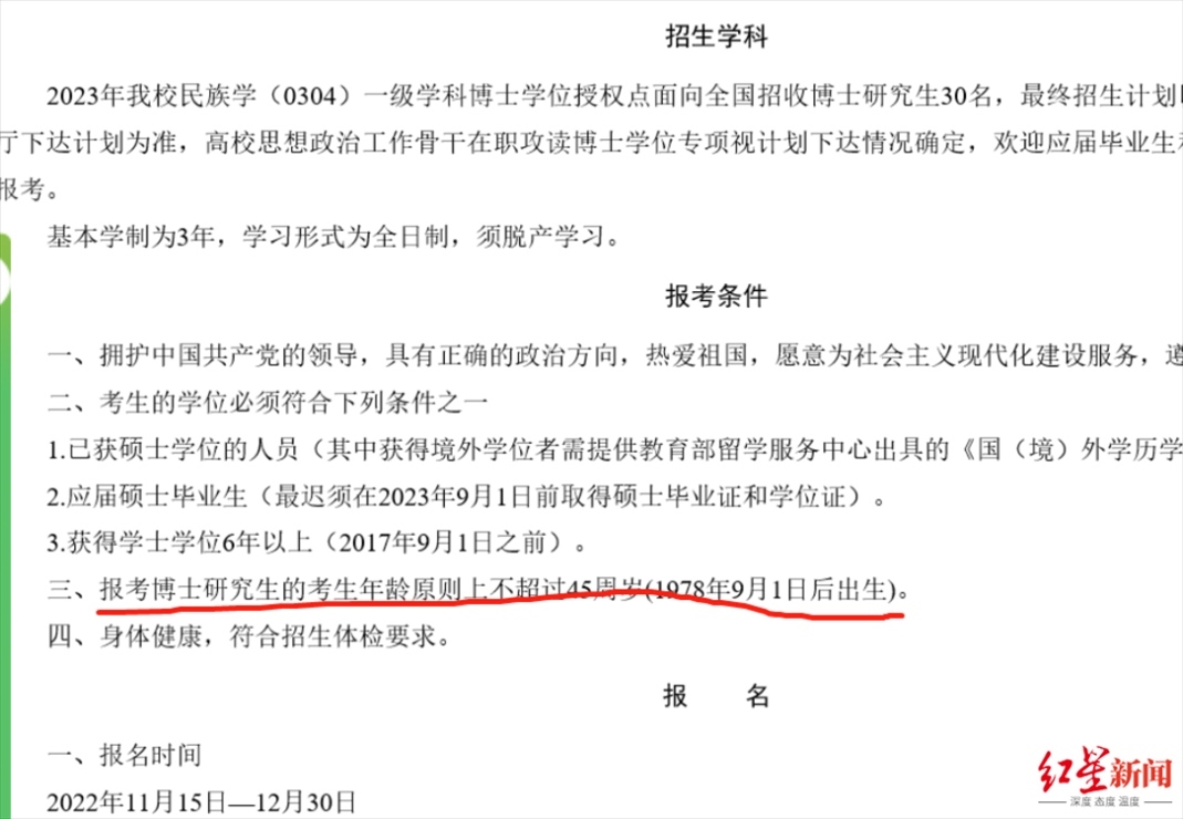 而根據(jù)《青海民族大學(xué)2023年民族學(xué)博士研究生招生簡(jiǎn)章》,報(bào)考博士研究生的考生年齡原則上不超過(guò)45周歲(1978年9月1日后出生)。資料顯示,阿進(jìn)錄為1973年出生。對(duì)于網(wǎng)友提到的“年齡不符合報(bào)考條件”,上述工作人員表示:“他資格審查是通過(guò)的?!?/strong>
