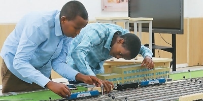 在位于吉布提首都吉布提市的吉布提工商學校,學生在魯班工坊鐵道運營沙盤教學區(qū)學習。 新華社發(fā)