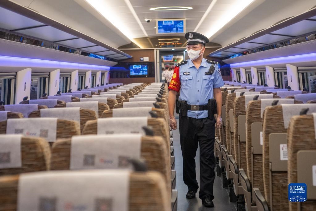 6月19日,鐵路公安在首發(fā)列車(chē)CR400AF復(fù)興號(hào)動(dòng)車(chē)組上進(jìn)行巡檢作業(yè)。新華社記者 唐奕 攝