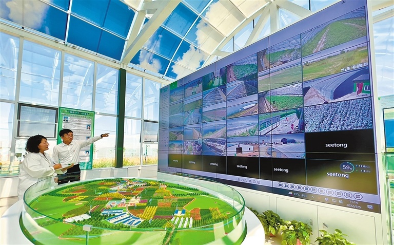 近日,巴彥淖爾市杭錦后旗二道橋鎮(zhèn)鄉(xiāng)村振興設(shè)施農(nóng)業(yè)產(chǎn)業(yè)園區(qū)工作人員正在記錄現(xiàn)代農(nóng)業(yè)數(shù)字平臺(tái)監(jiān)測數(shù)據(jù)。據(jù)悉,該園區(qū)占地2000畝,投資4600萬元,是集智慧農(nóng)業(yè)管理、引黃滴灌示范、集中連片種植等多項(xiàng)功能為一體的現(xiàn)代農(nóng)業(yè)產(chǎn)業(yè)園區(qū)。通過現(xiàn)代農(nóng)業(yè)數(shù)字平臺(tái),進(jìn)行智能管控、農(nóng)產(chǎn)品質(zhì)量檢測、科技培訓(xùn)、遠(yuǎn)程科技指導(dǎo),同時(shí)讓更多的農(nóng)戶利用APP與平臺(tái)共享數(shù)據(jù)資源,實(shí)現(xiàn)田間自動(dòng)化管理。園區(qū)通過平臺(tái)智能管控,今年第一茬種植麒麟西瓜,第二茬計(jì)劃種植葉菜類,兩茬畝均效益預(yù)計(jì)在2萬元以上。(記者 孟和朝魯 攝影報(bào)道)