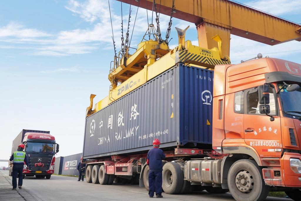 圖為南寧國際鐵路港內(nèi)集裝箱吊裝運(yùn)輸作業(yè)現(xiàn)場。(中國鐵路南寧局集團(tuán)有限公司供圖)