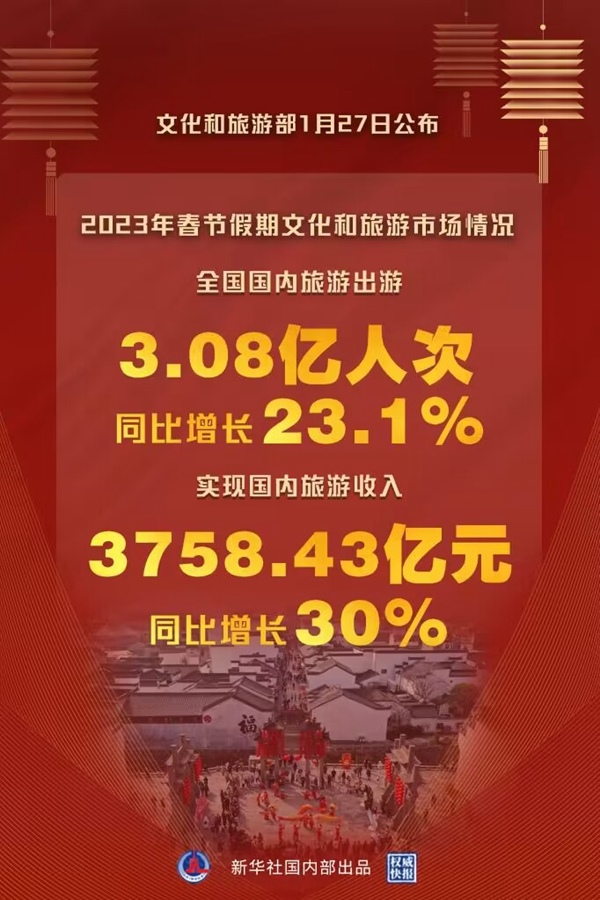 文化和旅游部27日公布2023年春節(jié)假期文化和旅游市場情況。經(jīng)文化和旅游部數(shù)據(jù)中心測算,今年春節(jié)假期全國國內旅游出游3.08億人次,同比增長23.1%。實現(xiàn)國內旅游收入3758.43億元,同比增長30%。全國文化和旅游市場總體安全平穩(wěn)有序。