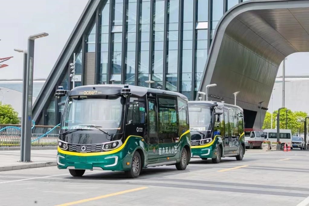 純電無(wú)人駕駛公交小巴穿梭在蘇州高鐵新城。(蘇州高鐵新城管委會(huì)供圖)