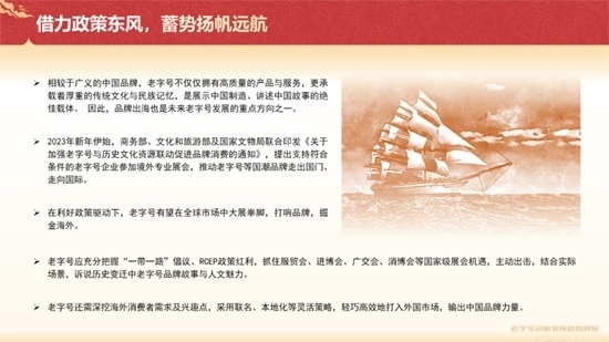 《報(bào)告》提到,在利好政策驅(qū)動(dòng)下,老字號(hào)有望在全球市場(chǎng)中大展拳腳,打響品牌,掘金海外。具體來(lái)看,老字號(hào)應(yīng)充分把握“一帶一路”倡議、RCEP政策紅利,抓住國(guó)家級(jí)展會(huì)機(jī)遇,主動(dòng)出擊,結(jié)合實(shí)際場(chǎng)景,訴說(shuō)歷史變遷中老字號(hào)品牌故事與人文魅力。