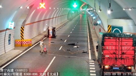 9月3日下午,在G4012溧寧高速葉麻尖隧道內(nèi),一輛小車碰撞隧道右側(cè)檢修帶,發(fā)生側(cè)翻,零部件散落一地。車內(nèi)3人被困,無法脫身,情況十分危險。1分鐘后,一輛牌照為浙G52FJ2的貨車經(jīng)過,司機(jī)李平江師傅見狀,立即把車停在緊急停車帶內(nèi),迅速下車并拿起隧道一側(cè)的隔離錐放在事故車后,用手勢示意后方來車減速慢行,防止二次事故發(fā)生。