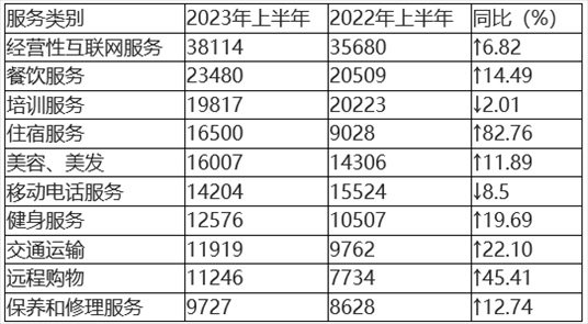 在具體服務(wù)投訴中,投訴量居前五位的分別為(如圖5、表5所示)經(jīng)營(yíng)性互聯(lián)網(wǎng)服務(wù)、餐飲服務(wù)、培訓(xùn)服務(wù)、住宿服務(wù)、美容美發(fā)。與2022年上半年相比,住宿服務(wù)、遠(yuǎn)程購物、保養(yǎng)和修理服務(wù)進(jìn)入服務(wù)類投訴前十。其中,住宿服務(wù)、遠(yuǎn)程購物投訴量同比顯著增長(zhǎng),移動(dòng)電話服務(wù)投訴量同比有所下降。