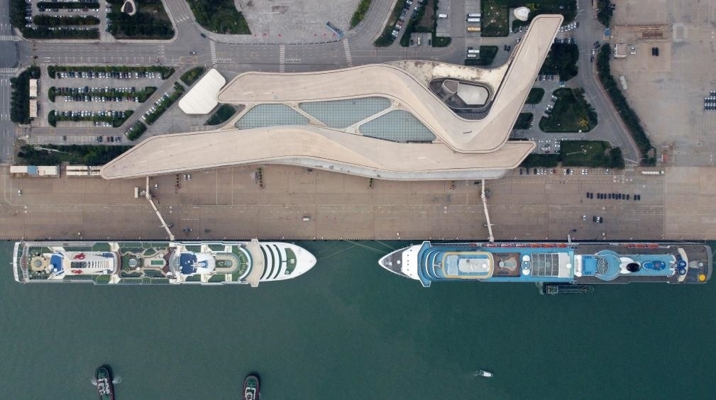 9月27日,“夢想”號(hào)郵輪(左)、“地中海”號(hào)郵輪靠泊在天津國際郵輪母港準(zhǔn)備啟航(無人機(jī)照片)。新華社記者 趙子碩 攝