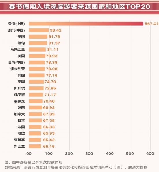 春節(jié)假期期間, 136.6萬人的入境深度游客(來自境外,并在大陸城市停留6小時(shí)以上的游客人數(shù),以下簡稱“深度游”)的大數(shù)據(jù)樣本顯示,入境游客量前20的城市共接待入境深度游客87.0萬人。
