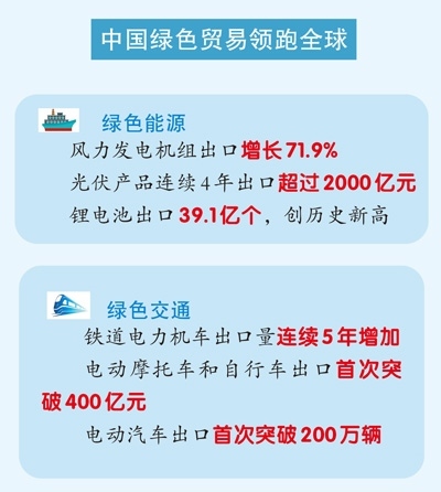風(fēng)力發(fā)電機(jī)組出口增長超七成;光伏產(chǎn)品連續(xù)4年出口超2000億元;鋰電池出口創(chuàng)歷史新高……海關(guān)總署新聞發(fā)言人、統(tǒng)計(jì)分析司司長呂大良表示,2024年,中國綠色貿(mào)易領(lǐng)跑全球。中國綠色產(chǎn)品不僅豐富了全球供給,也為全球應(yīng)對氣候變化和綠色低碳轉(zhuǎn)型作出了巨大貢獻(xiàn)。