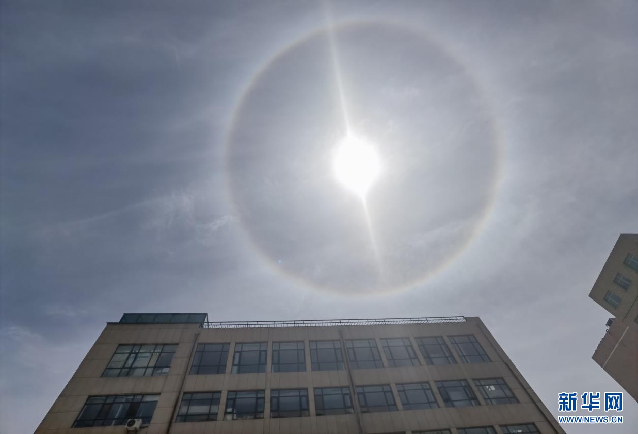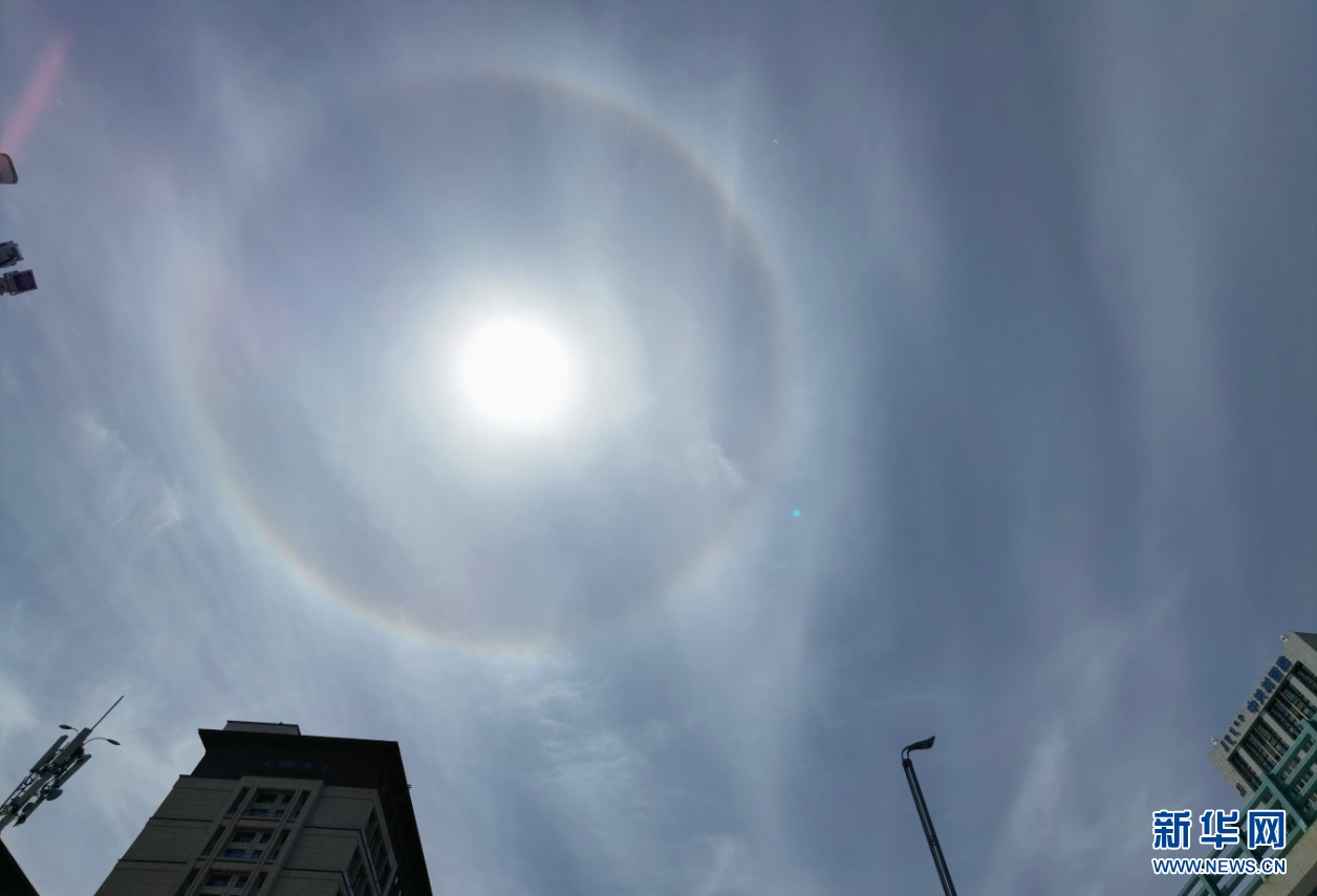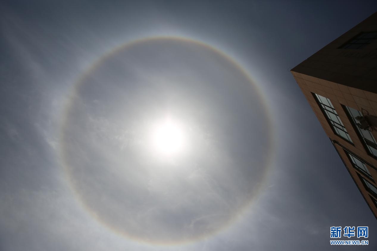 5月25日午后,內蒙古自治區(qū)呼和浩特市上空出現日暈,巨大的暈環(huán)圍繞在太陽四周,十分壯觀。新華網 楊騰格爾 攝