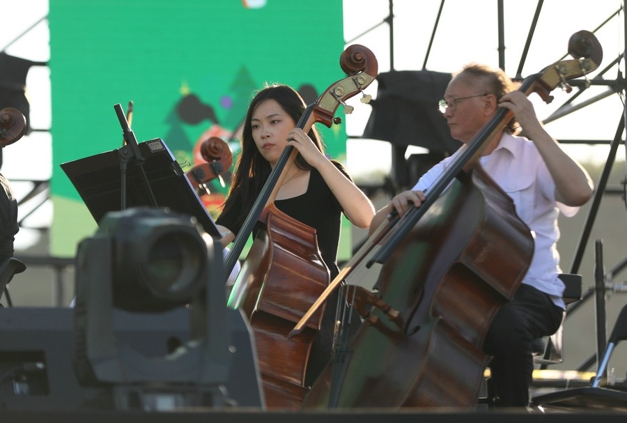 青山攬翠,林海歡歌。8月19日,內(nèi)蒙古烏蘭察布“森林之韻”蘇木山音樂季在蘇木山腳下的店子鎮(zhèn)盧家營村繼續(xù)上演。空中視角下的音樂季演出現(xiàn)場,燈光璀璨,人頭攢動。樹樂隊(duì)、翅膀VS呼哈、劉文天、巫啟賢、陳雅森等演藝人員和北京藝鯤交響樂團(tuán),為游客帶來一場場視聽盛宴。