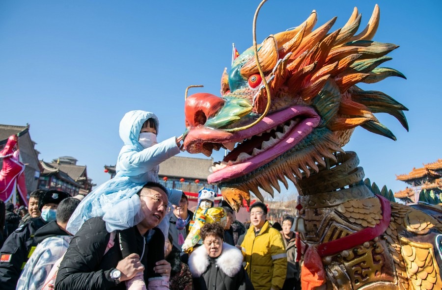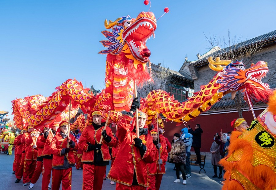 2024年2月15日,民間藝人在呼和浩特新春文化廟會現場進行舞龍表演。丁根厚 攝