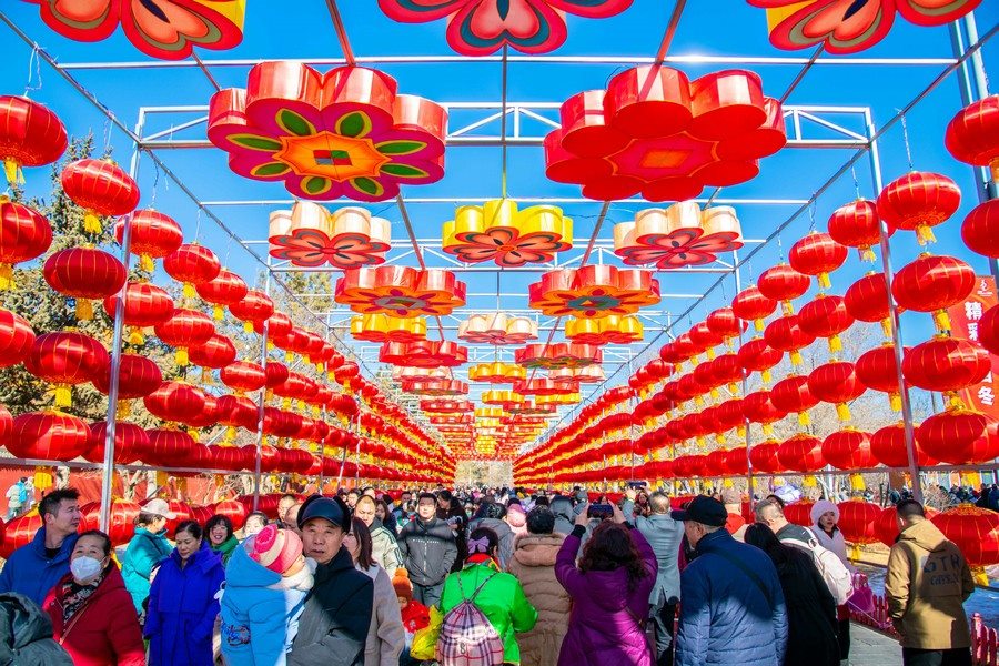2024年2月15日,人們在呼和浩特市玉泉區(qū)塞上老街旅游休閑街區(qū)燈籠長廊內游玩。丁根厚 攝