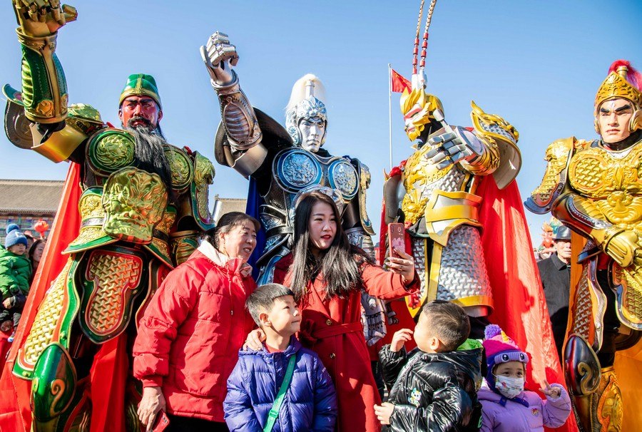 2024年2月15日,人們在呼和浩特市玉泉區(qū)塞上老街旅游休閑街區(qū)與國風機甲拍照留影。丁根厚 攝