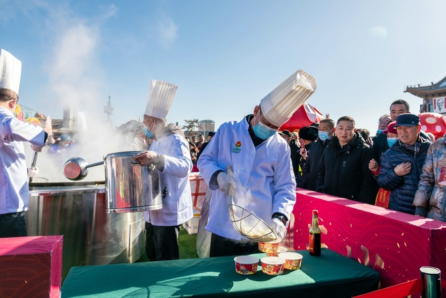 2024年2月15日,工作人員在呼和浩特市玉泉區(qū)塞上老街旅游休閑街區(qū)“千人餃子”品鑒活動現場為游客盛餃子。丁根厚 攝