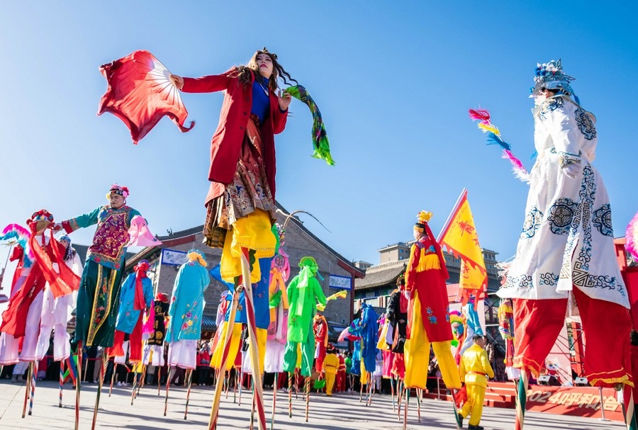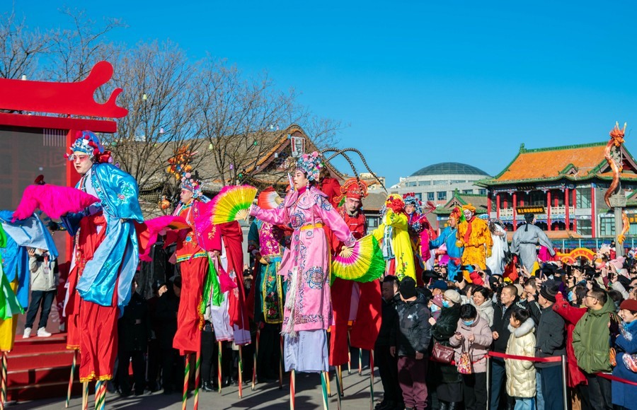 2024年2月15日,民間藝人在呼和浩特新春文化廟會現場進行踩高蹺表演。丁根厚 攝