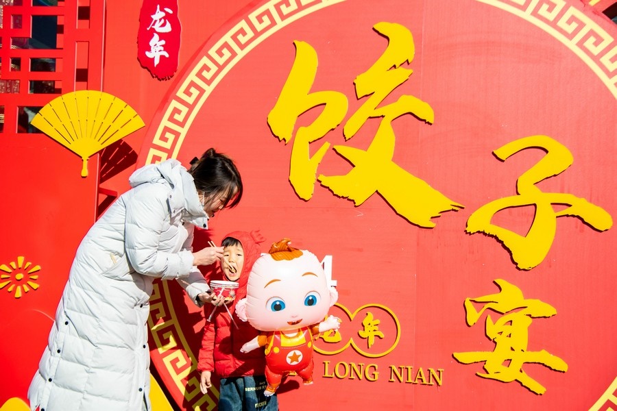 2024年2月15日,人們在呼和浩特市玉泉區(qū)塞上老街旅游休閑街區(qū)“千人餃子”品鑒活動現場品嘗餃子。丁根厚 攝